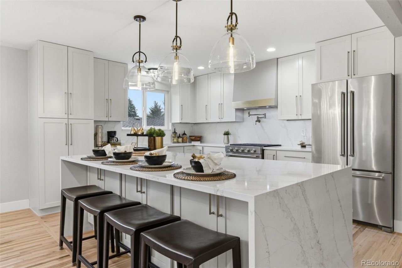 Designer-remodeled mid-century home in Holly Hills ? one of Denvers most sought-after neighborhoods ? now back on the market with significant improvements and enhanced buyer incentives.Recently withdrawn to complete upgrades, the home returns with fully finished landscaping, including fresh sod and a brand-new sprinkler system, creating a turnkey outdoor space ready to enjoy.Now offered at $950,000 with seller concessions, this is a rare opportunity to secure a move-in-ready, fully remodeled home with added financial flexibility.Inside, youll find 2,899 sq ft of thoughtfully designed living space featuring 5 bedrooms and 3 bathrooms. The chefs kitchen anchors the main level with a massive quartz island, premium cabinetry, pot filler, and professional-grade appliances ? perfect for both everyday living and entertaining. Rich hardwood floors and an open-concept layout create a seamless, modern flow.The main-level primary suite offers true convenience and comfort, complete with dual walk-in closets and a spa-inspired five-piece bath.A standout feature is the fully finished walk-out lower level, offering three legal bedrooms, a full bathroom, spacious living area, and a sleek wet bar ? ideal for multi-generational living, guest accommodations, or flexible use with income potential.Enjoy peaceful evenings in the sun-filled solar room with stunning Rocky Mountain sunset views.Built for modern living with an EV-ready 2-car garage, tankless water heater, energy-efficient windows, and green-certified appliances. A full sound barrier wall ensures a quiet and private environment.Prime location just minutes from DTC, Cherry Creek, and I-25, with walkable access to Starbucks, King Soopers, and dining.No HOA. Zoned for Bradley, Hamilton, and Thomas Jefferson.Vacant and move-in ready. Furniture negotiable.Back on market. Improved. Priced to sell. This is your opportunity.