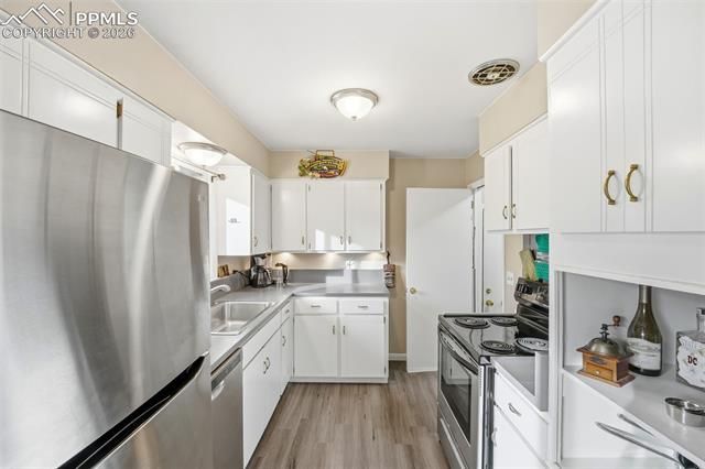 Beautifully updated home situated on a spacious corner lot near University of Colorado Colorado Springs, offering stunning Pikes Peak views and unbeatable access to outdoor recreation, including nearby Palmer Park. This move-in ready property combines modern upgrades with versatile living space, making it ideal for a variety of lifestyles. Step inside to find hardwood floors throughout the main level, complemented by abundant natural light from updated vinyl windows. The beautifully updated kitchen features stainless steel appliances, ample cabinetry, and a functional layout perfect for both daily living and entertaining. Updated bathrooms add a fresh, modern touch. The home offers four bedrooms and two full bathrooms, providing plenty of space for family, guests, or a home office. The finished basement features durable LVP flooring throughout, along with a convenient kitchenette and separate exterior access—ideal for multi-generational living, guests, or potential rental income. Outside, enjoy the expansive, newly fenced yard with plenty of room for outdoor activities, pets, or gardening. The property also includes RV parking, adding extra convenience and flexibility. Major system updates provide peace of mind, including a new furnace, new water heater, new central air conditioning and new main electric panel. With its prime location, thoughtful updates, and versatile layout, this home offers an exceptional opportunity to enjoy comfort, convenience, and Colorado living at its best. Don’t miss your chance to own this incredible property!